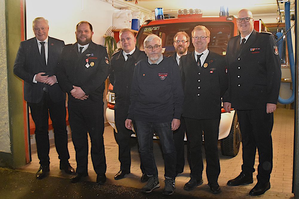 Foto (v.l.): Bürgermeister Daniel Hartmann, Steffen König, Fabian Kroos, Josef Schmitz, Löschgruppenführer Andreas Mühlen, Andreas Rode, Leiter der Feuerwehr Jürgen Schmits
